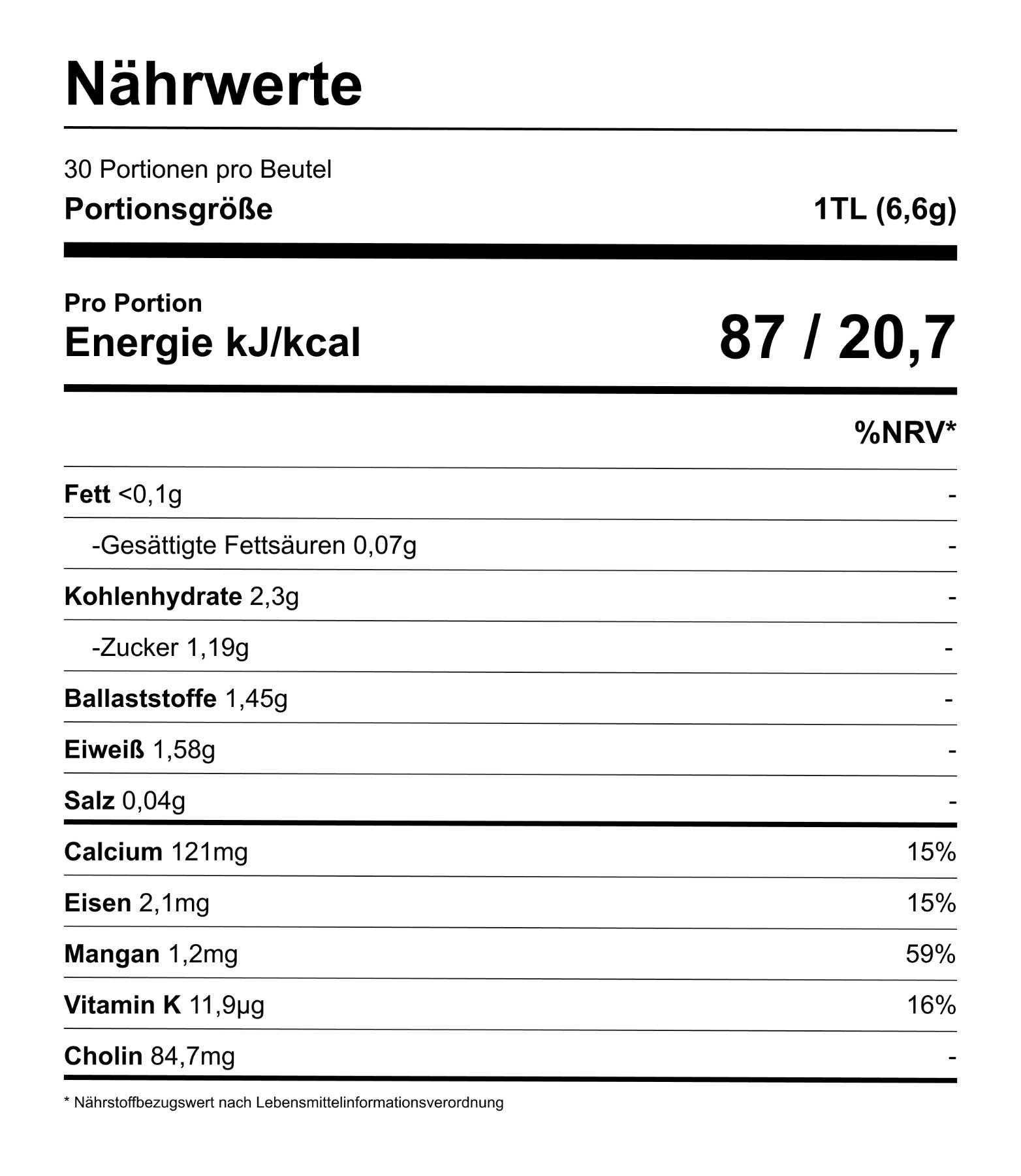Gerstengraspulver, Spirulinapulver, Matcha-Pulver, natürliche Aromen, Apfelpulver, Wilde Heidelbeere Pulver, Chlorella Pulver, Säuerungsmittel (Citronensäure), Inulin, Ceylon Zimt Pulver, Dulse-Rotalge Pulver, Süßungsmittel (Stevioglykoside aus Stevia E960a), Koriander Pulver, Cholin Bitartrate, Calciumcarbonat