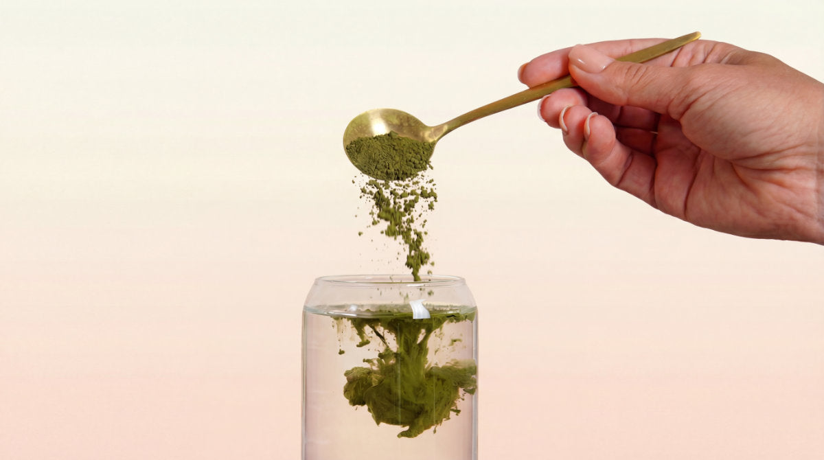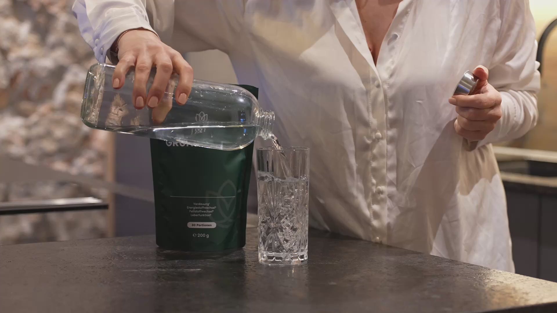 Nimm einen Teelöffel Grüne Helfer aus dem Beutel und schütte ihn in ein Glas mit 300ml Wasser, Saft oder Smoothie.